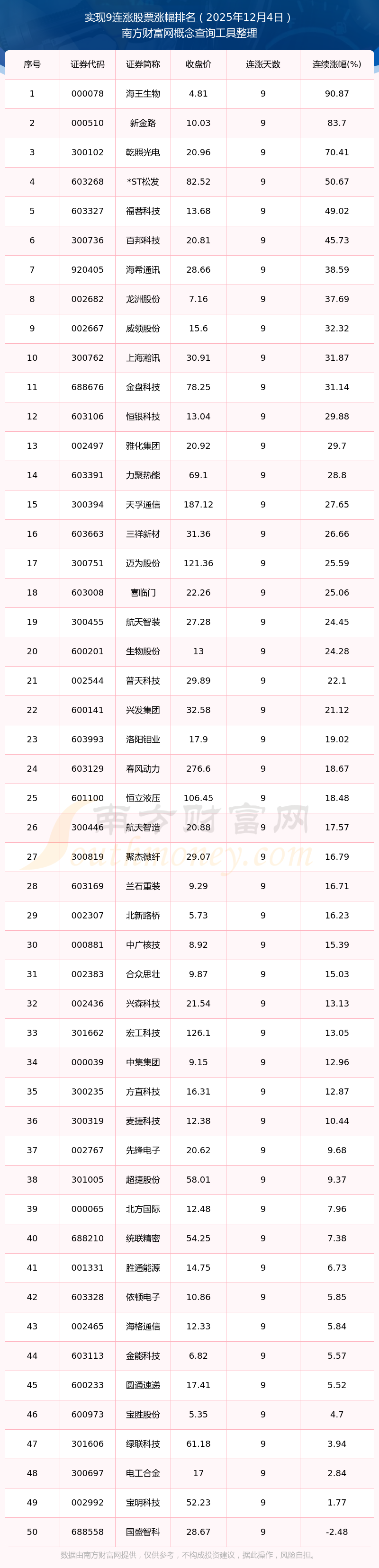 根据南方财富网概念查询工具数据统计,截止2025年12月4日收盘,共有50只个股实现9天连涨。其中连续涨幅较大的个股有海王生物、新金路、乾照光电等,连续涨幅分别为90.87%、83.70%、70.41%。
