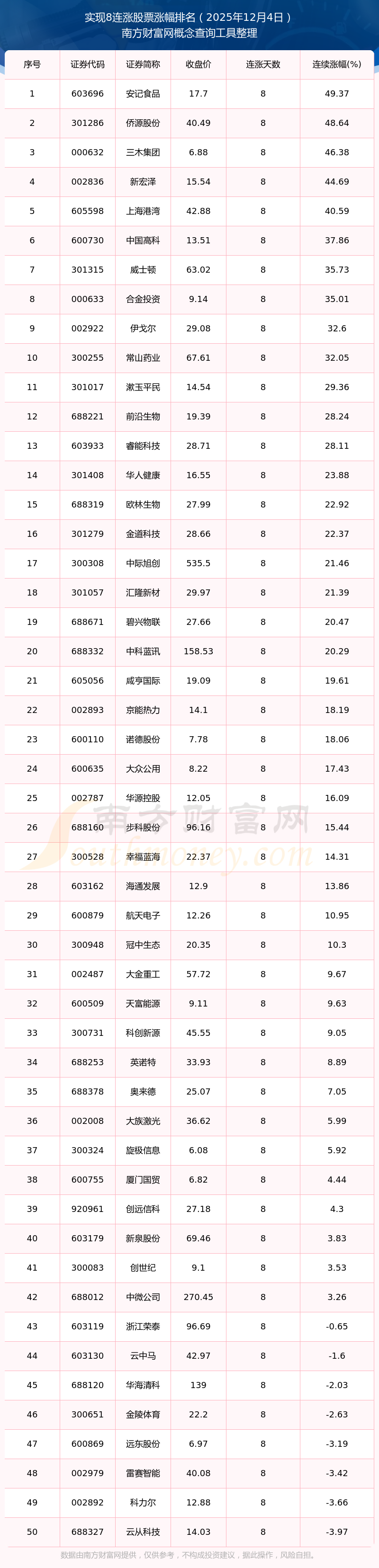 根据南方财富网概念查询工具数据统计,截止2025年12月4日收盘,共有55只个股实现8天连涨。其中连续涨幅较大的个股有安记食品、侨源股份、三木集团等,连续涨幅分别为49.37%、48.64%、46.38%。