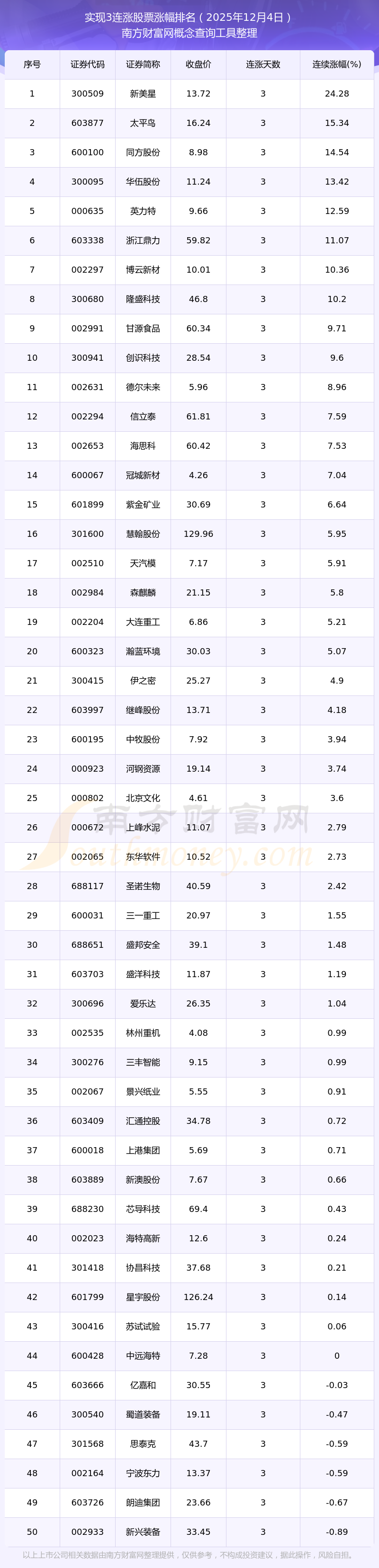 根据南方财富网概念查询工具数据统计,截止2025年12月4日收盘,共有114只个股实现3天连涨。其中连续涨幅较大的个股有新美星、太平鸟、同方股份等,连续涨幅分别为24.28%、15.34%、14.54%。