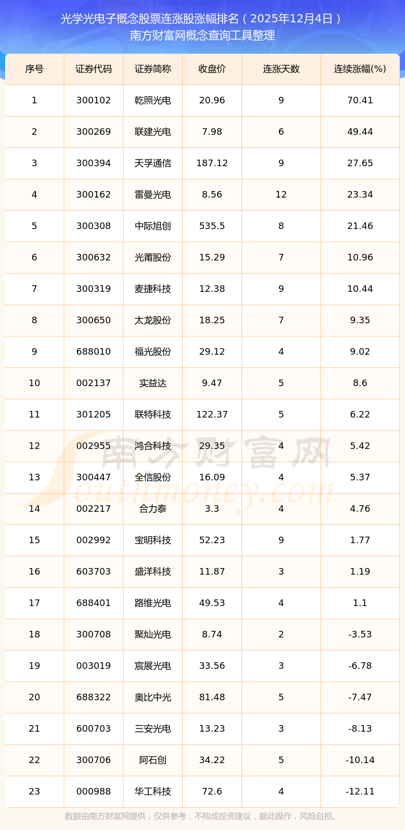2025年12月4日光学光电子概念股票连涨股涨幅排名