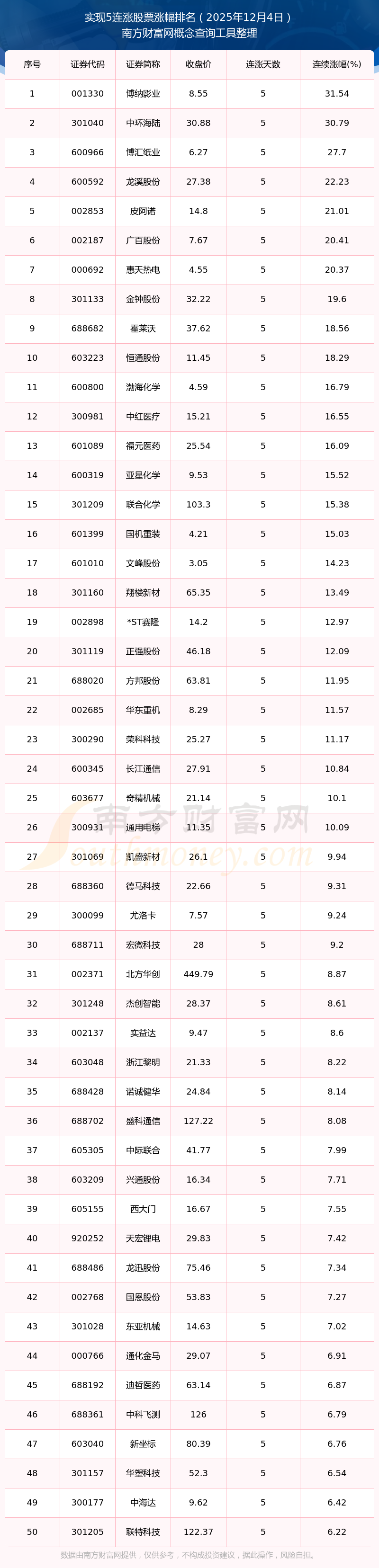 根据南方财富网概念查询工具数据统计,截止2025年12月4日收盘,共有144只个股实现5天连涨。其中连续涨幅较大的个股有博纳影业、中环海陆、博汇纸业等,连续涨幅分别为31.54%、30.79%、27.70%。