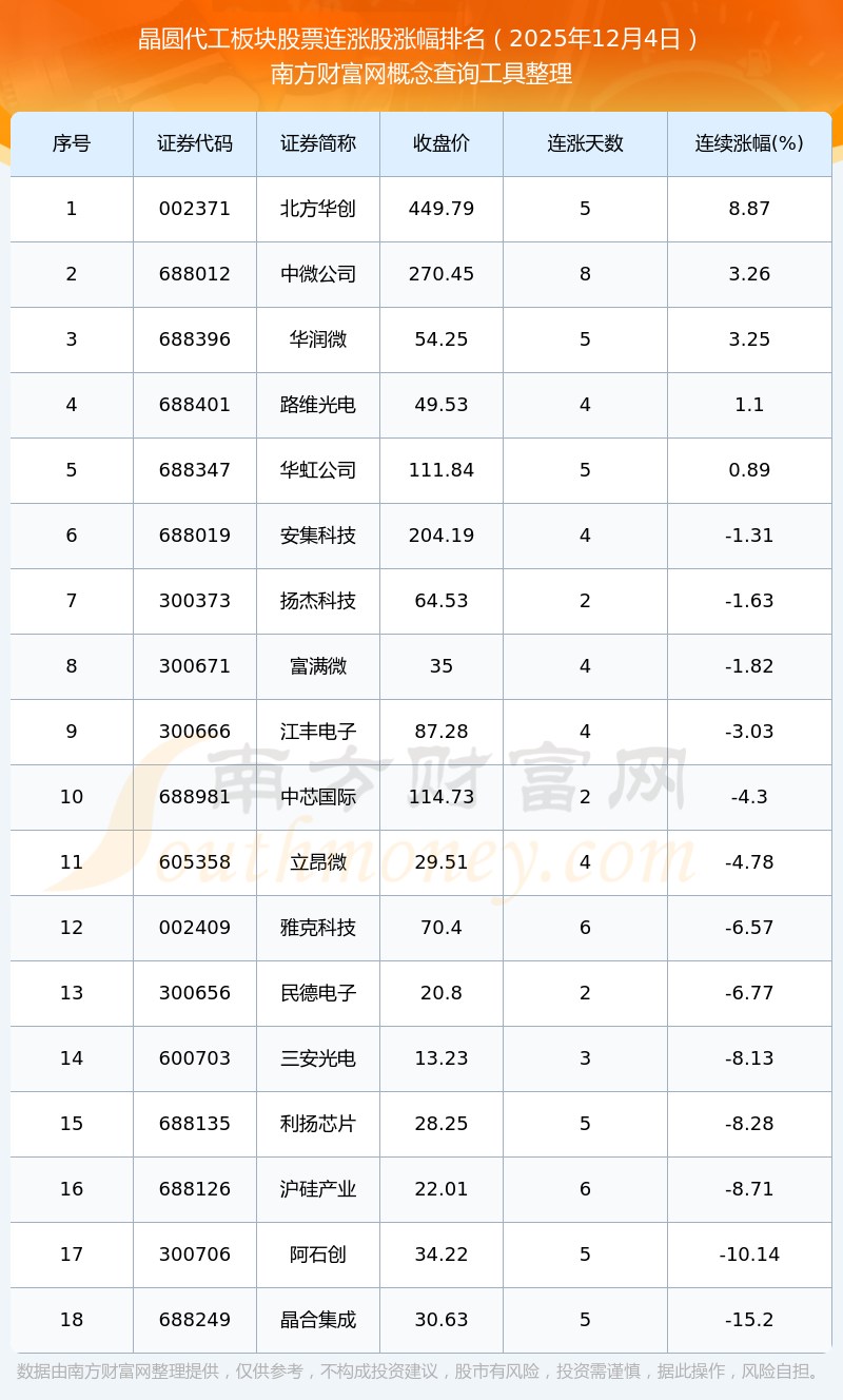 根据南方财富网概念查询工具数据统计,截止2025年12月4日收盘,晶圆代工板块股票共有18只个股实现连涨。其中连续涨幅较大的个股有北方华创、中微公司、华润微等,连续涨幅分别为8.87%、3.26%、3.25%。
