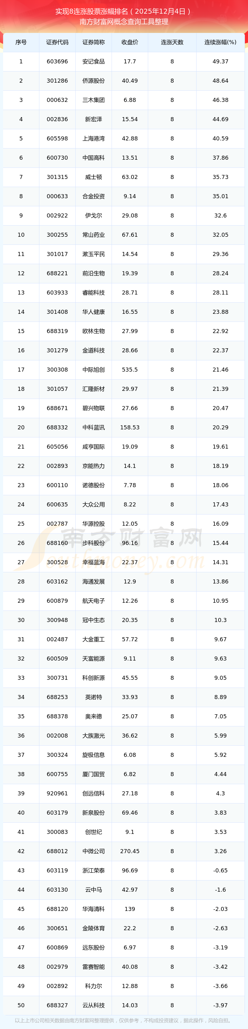 2025年12月4日实现8连涨股票涨幅排名