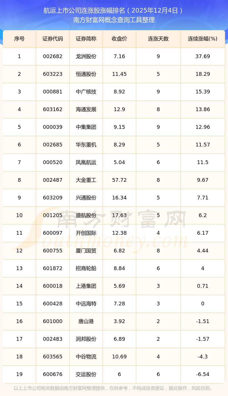 根据南方财富网概念查询工具数据统计,截止2025年12月4日收盘,航运上市公司共有19只个股实现连涨。其中连续涨幅较大的个股有龙洲股份、恒通股份、中广核技等,连续涨幅分别为37.69%、18.29%、15.39%。