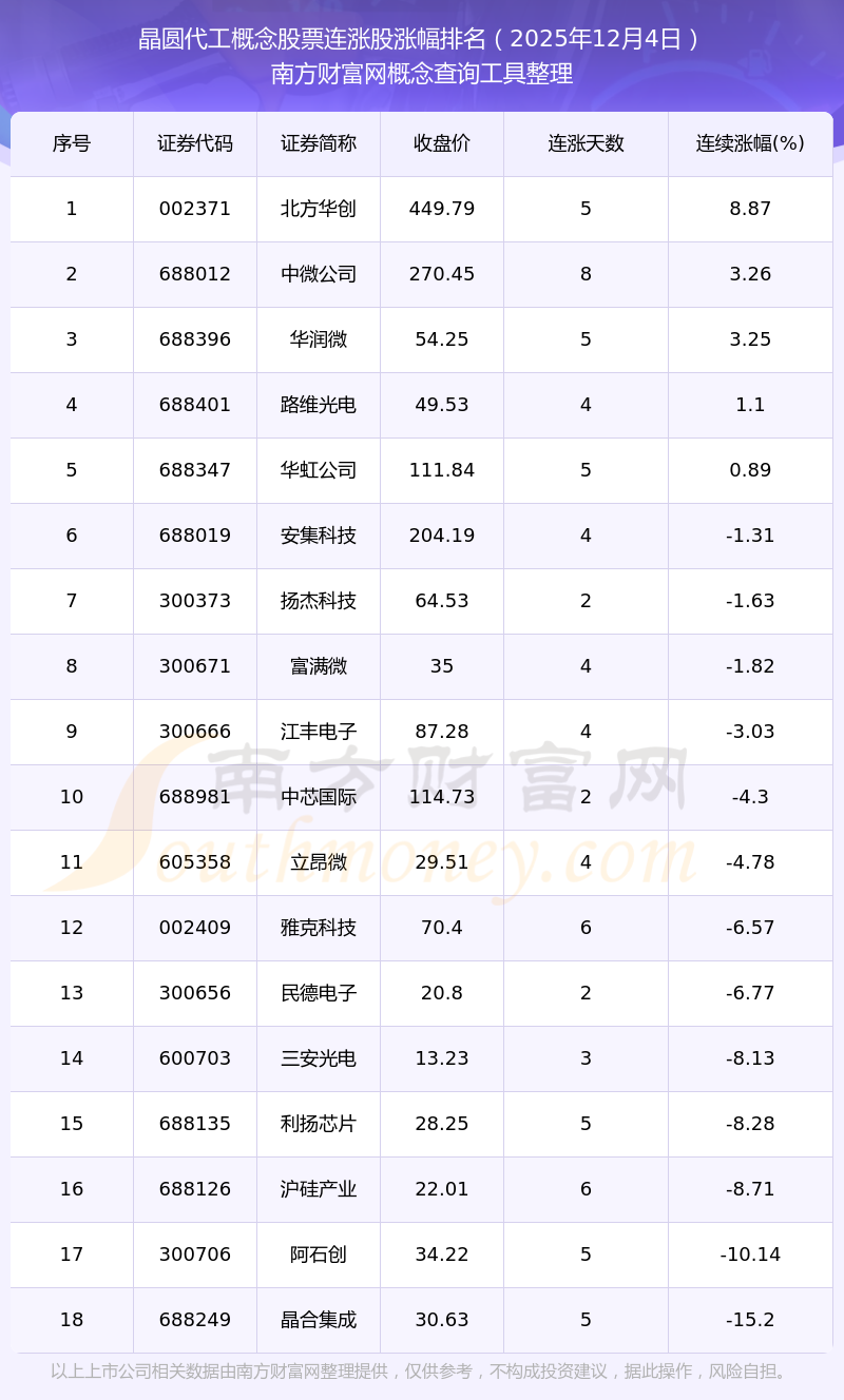 2025年12月4日晶圆代工概念股票连涨股票涨幅排名