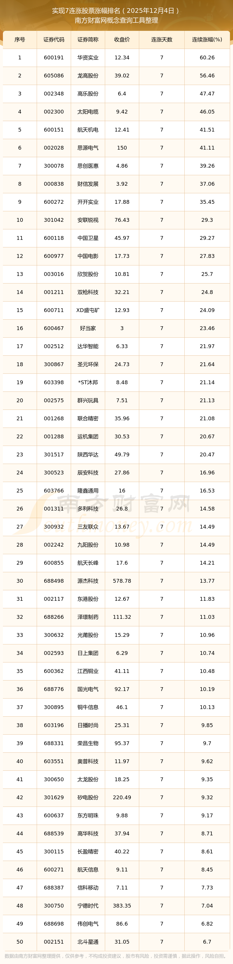 2025年12月4日连涨7天的股票涨幅排名