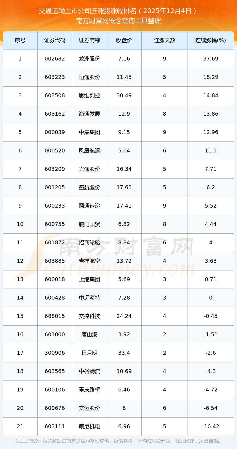 根据南方财富网概念查询工具数据统计,截止2025年12月4日收盘,交通运输上市公司共有21只个股实现连涨。其中连续涨幅较大的个股有龙洲股份、恒通股份、思维列控等,连续涨幅分别为37.69%、18.29%、14.84%。