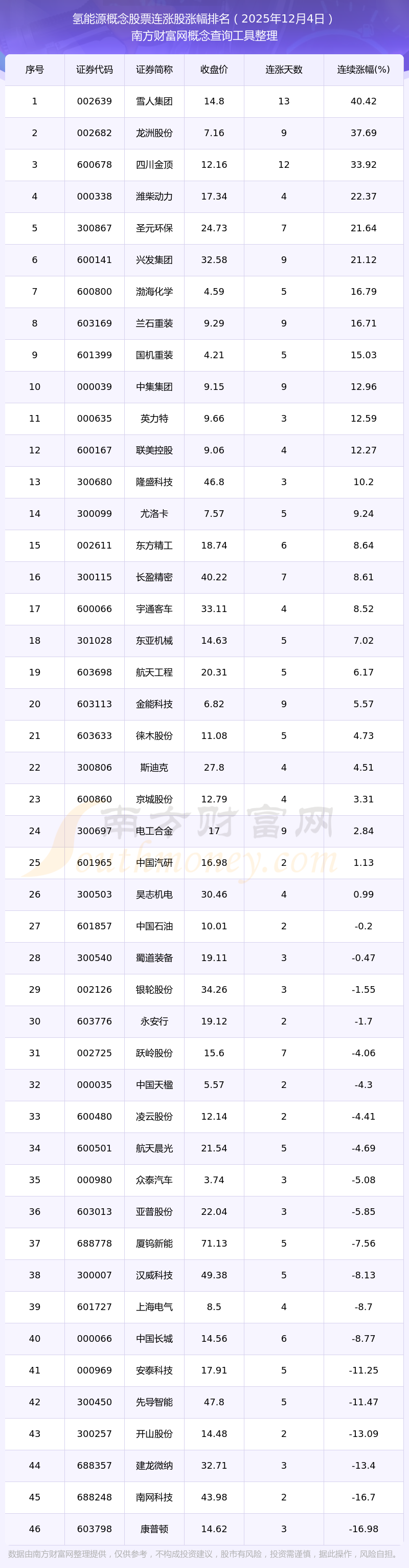 根据南方财富网概念查询工具数据统计,截止2025年12月4日收盘,氢能源概念股票共有46只个股实现连涨。其中连续涨幅较大的个股有雪人集团、龙洲股份、四川金顶等,连续涨幅分别为40.42%、37.69%、33.92%。