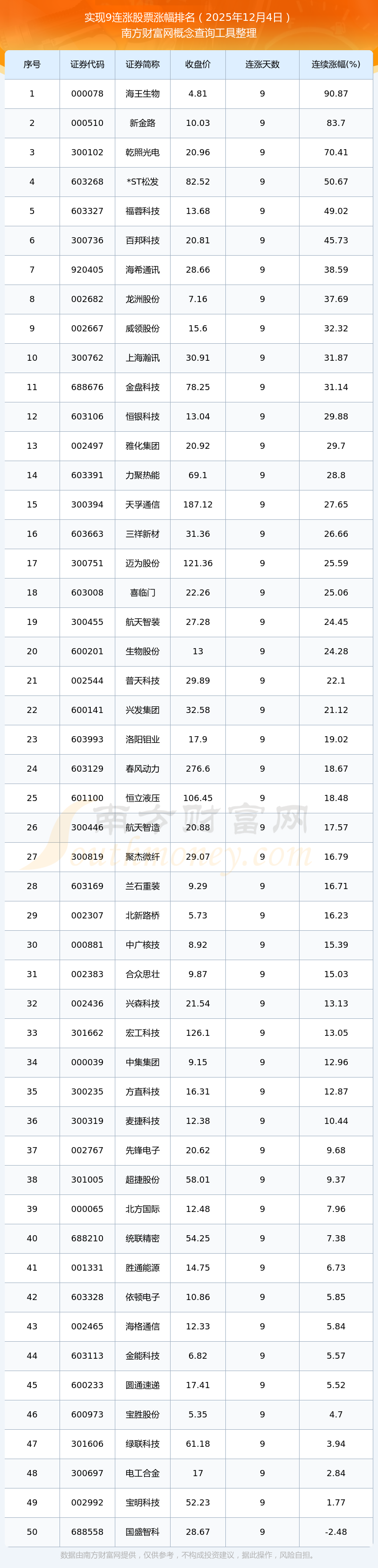根据南方财富网概念查询工具数据统计,截止2025年12月4日收盘,共有50只个股实现9天连涨。其中连续涨幅较大的个股有海王生物、新金路、乾照光电等,连续涨幅分别为90.87%、83.70%、70.41%。