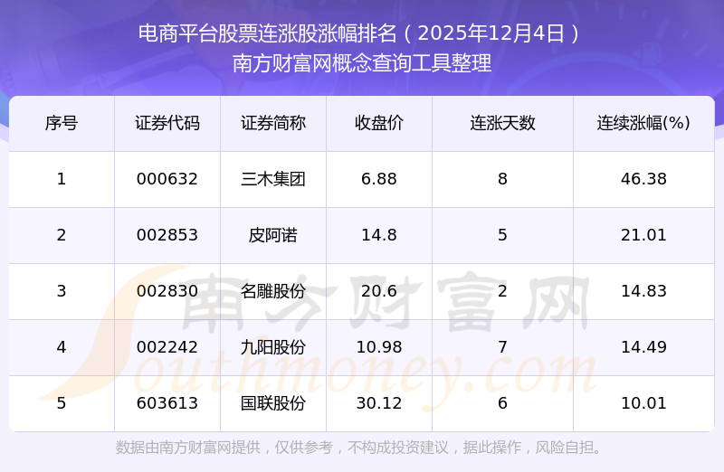 根据南方财富网概念查询工具数据统计,截止2025年12月4日收盘,电商平台股票共有5只个股实现连涨。其中连续涨幅较大的个股有三木集团、皮阿诺、名雕股份等,连续涨幅分别为46.38%、21.01%、14.83%。