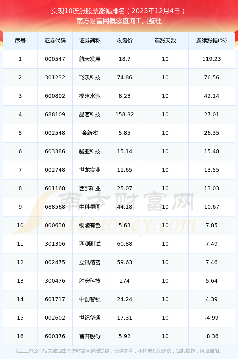根据南方财富网概念查询工具数据统计,截止2025年12月4日收盘,共有16只个股实现10天连涨。其中连续涨幅较大的个股有航天发展、飞沃科技、福建水泥等,连续涨幅分别为119.23%、76.56%、42.14%。