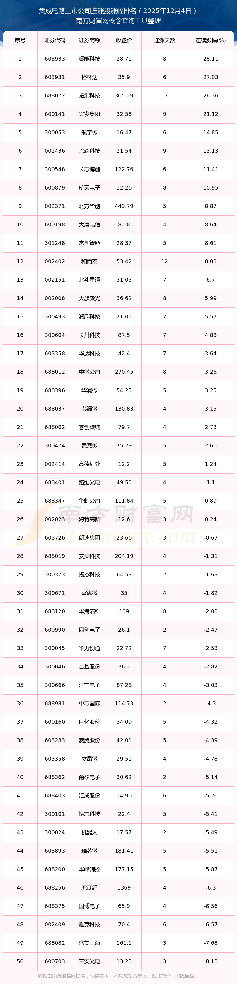 2025年12月4日集成电路上市公司连涨股涨幅排名