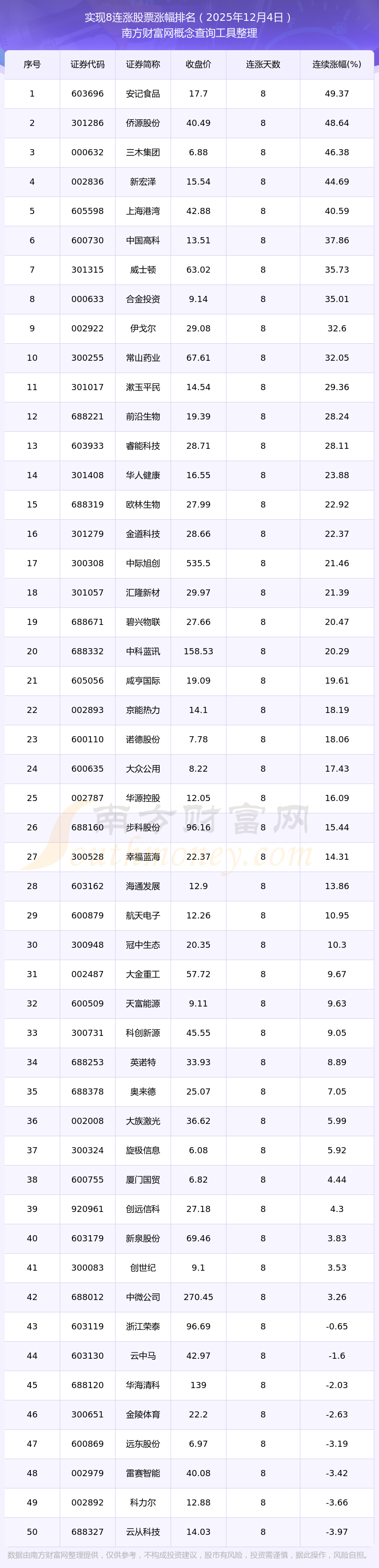根据南方财富网概念查询工具数据统计,截止2025年12月4日收盘,共有55只个股实现8天连涨。其中连续涨幅较大的个股有安记食品、侨源股份、三木集团等,连续涨幅分别为49.37%、48.64%、46.38%。