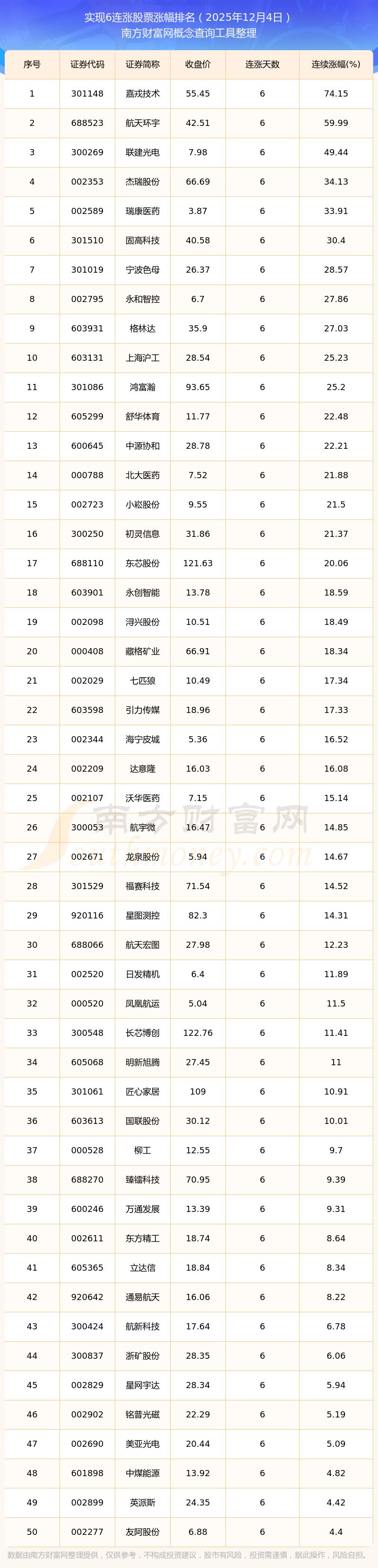 根据南方财富网概念查询工具数据统计,截止2025年12月4日收盘,共有108只个股实现6天连涨。其中连续涨幅较大的个股有嘉戎技术、航天环宇、联建光电等,连续涨幅分别为74.15%、59.99%、49.44%。