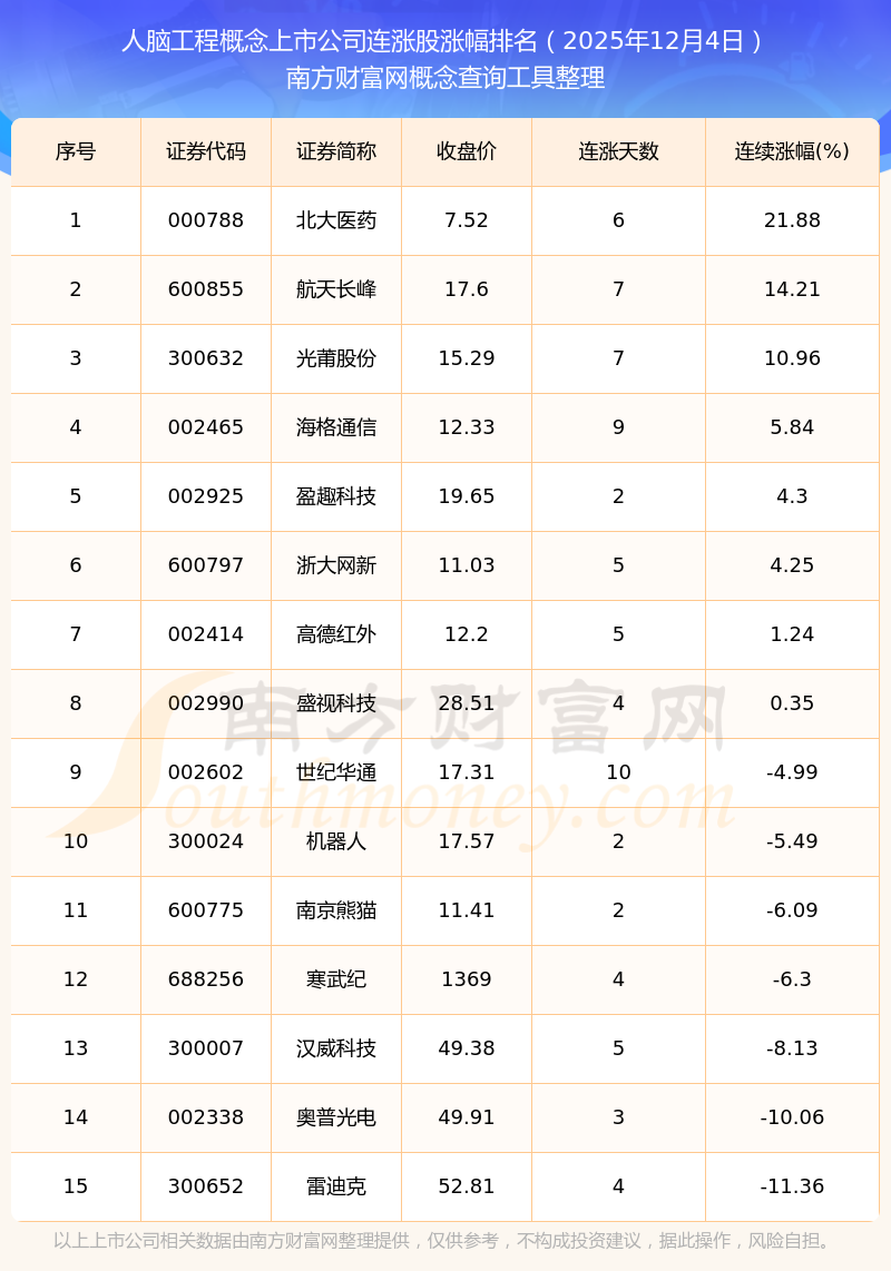 2025年12月4日人脑工程概念上市公司连涨股票涨幅排名
