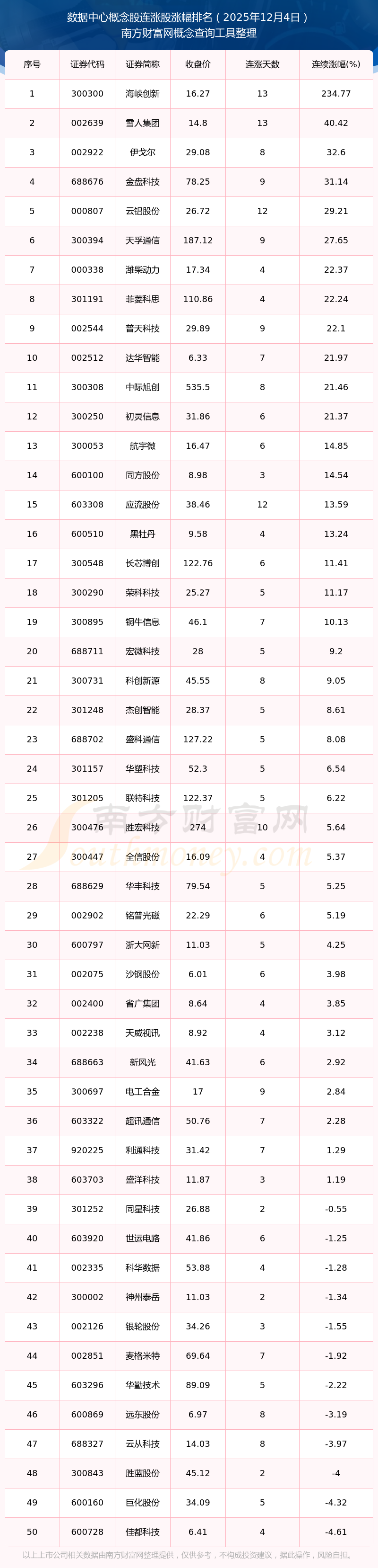 2025年12月4日数据中心概念股连涨股涨幅排名