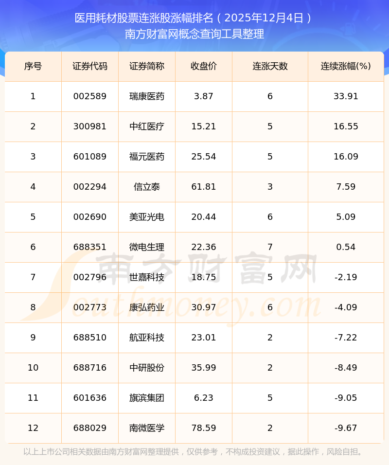 2025年12月4日医用耗材股票连涨股涨幅排名