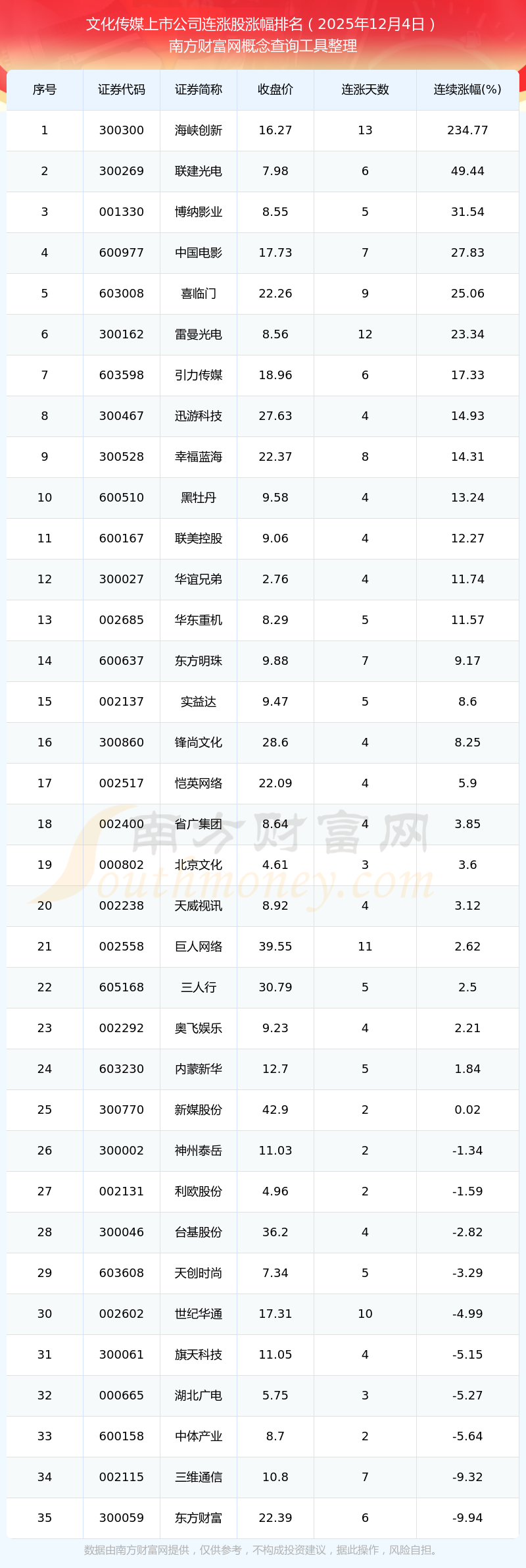 根据南方财富网概念查询工具数据统计,截止2025年12月4日收盘,文化传媒上市公司共有35只个股实现连涨。其中连续涨幅较大的个股有海峡创新、联建光电、博纳影业等,连续涨幅分别为234.77%、49.44%、31.54%。