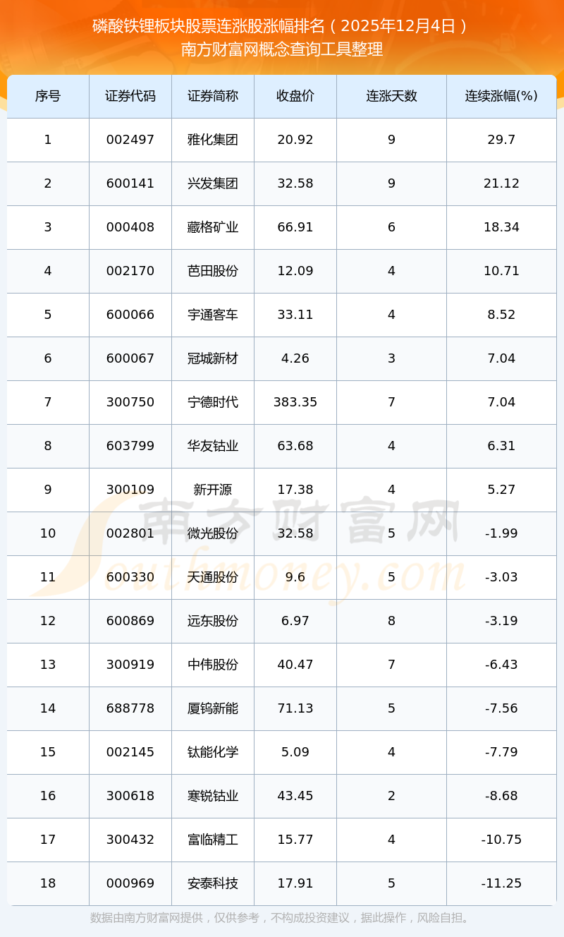 2025年12月4日磷酸铁锂板块股票连涨股涨幅排名