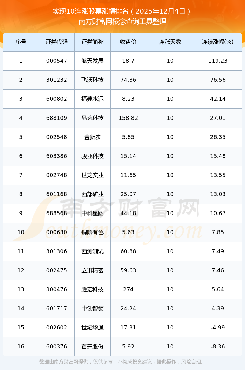 根据南方财富网概念查询工具数据统计,截止2025年12月4日收盘,共有16只个股实现10天连涨。其中连续涨幅较大的个股有航天发展、飞沃科技、福建水泥等,连续涨幅分别为119.23%、76.56%、42.14%。