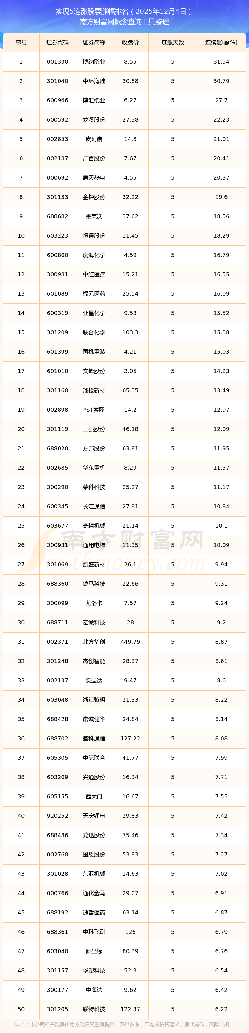 根据南方财富网概念查询工具数据统计,截止2025年12月4日收盘,共有144只个股实现5天连涨。其中连续涨幅较大的个股有博纳影业、中环海陆、博汇纸业等,连续涨幅分别为31.54%、30.79%、27.70%。