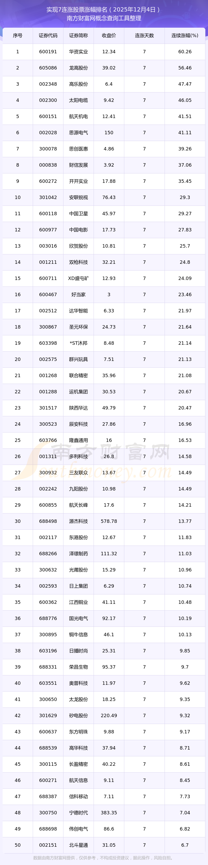 根据南方财富网概念查询工具数据统计,截止2025年12月4日收盘,共有94只个股实现7天连涨。其中连续涨幅较大的个股有华资实业、龙高股份、高乐股份等,连续涨幅分别为60.26%、56.46%、47.47%。