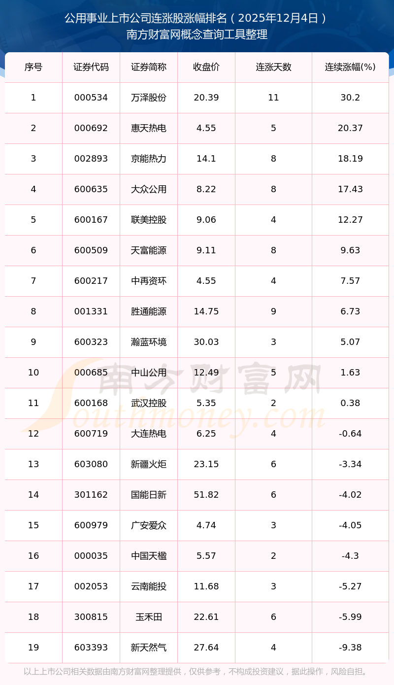 2025年12月4日公用事业上市公司连涨股票涨幅排名