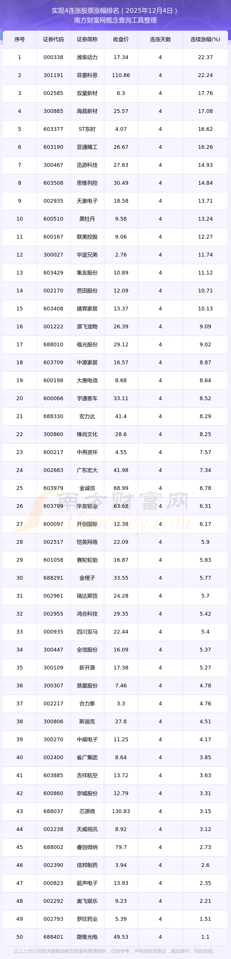 根据南方财富网概念查询工具数据统计,截止2025年12月4日收盘,共有128只个股实现4天连涨。其中连续涨幅较大的个股有潍柴动力、菲菱科思、双星新材等,连续涨幅分别为22.37%、22.24%、17.76%。