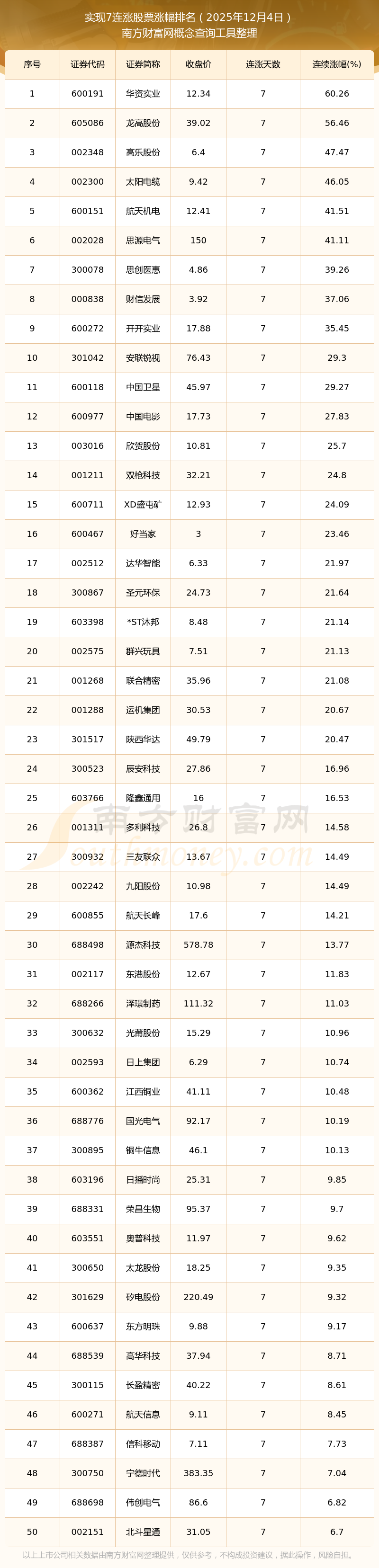 2025年12月4日实现7连涨股票涨幅排名