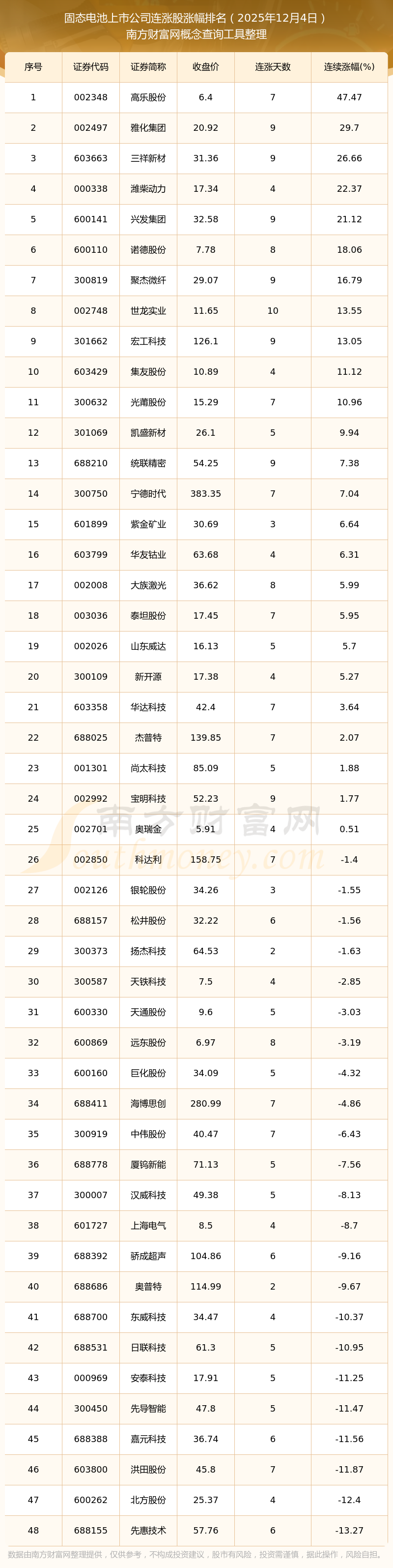 根据南方财富网概念查询工具数据统计,截止2025年12月4日收盘,固态电池上市公司共有48只个股实现连涨。其中连续涨幅较大的个股有高乐股份、雅化集团、三祥新材等,连续涨幅分别为47.47%、29.70%、26.66%。