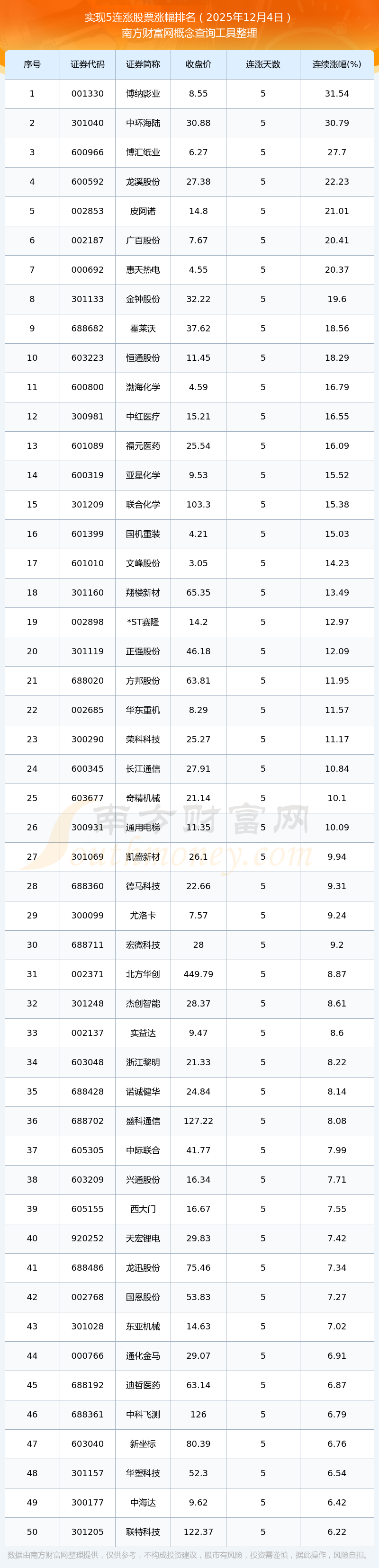 根据南方财富网概念查询工具数据统计,截止2025年12月4日收盘,共有144只个股实现5天连涨。其中连续涨幅较大的个股有博纳影业、中环海陆、博汇纸业等,连续涨幅分别为31.54%、30.79%、27.70%。