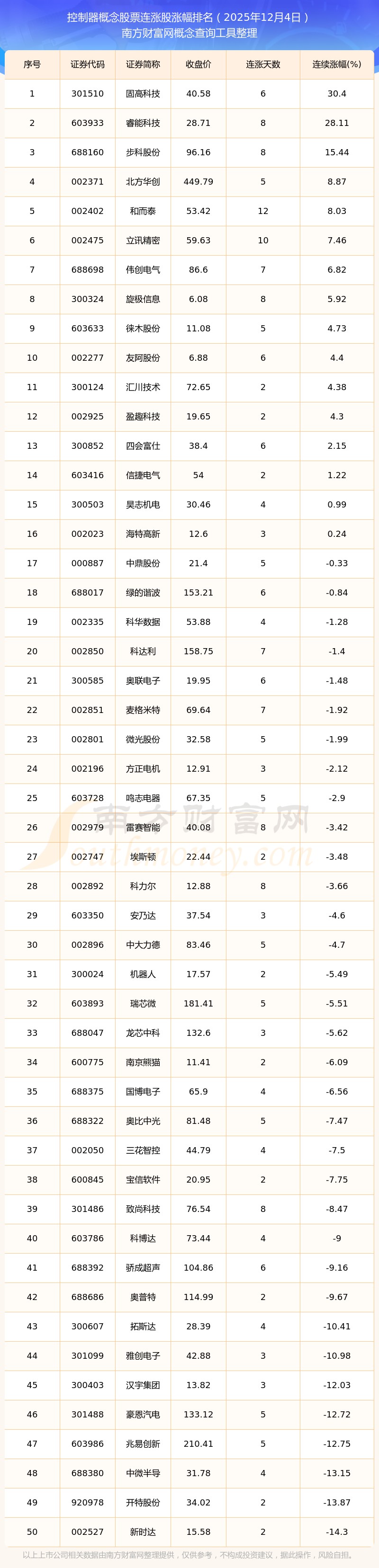 2025年12月4日控制器概念股票连涨股涨幅排名