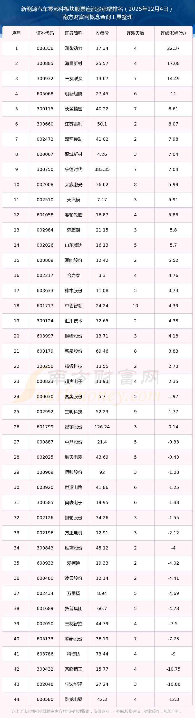 2025年12月4日新能源汽车零部件板块股票连涨股涨幅排名