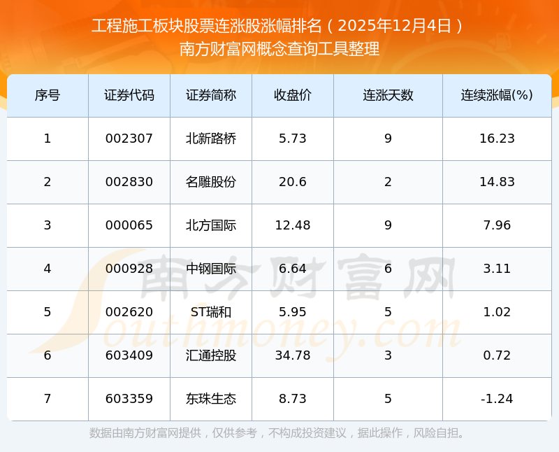 根据南方财富网概念查询工具数据统计,截止2025年12月4日收盘,工程施工板块股票共有7只个股实现连涨。其中连续涨幅较大的个股有北新路桥、名雕股份、北方国际等,连续涨幅分别为16.23%、14.83%、7.96%。