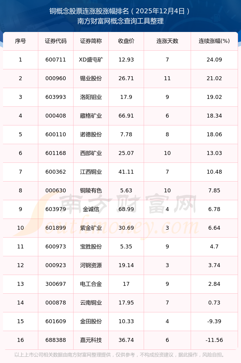 根据南方财富网概念查询工具数据统计,截止2025年12月4日收盘,铜概念股票共有16只个股实现连涨。其中连续涨幅较大的个股有XD盛屯矿、锡业股份、洛阳钼业等,连续涨幅分别为24.09%、21.02%、19.02%。
