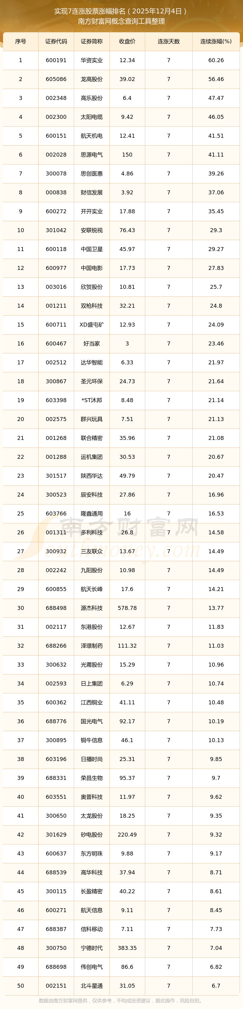 根据南方财富网概念查询工具数据统计,截止2025年12月4日收盘,共有94只个股实现7天连涨。其中连续涨幅较大的个股有华资实业、龙高股份、高乐股份等,连续涨幅分别为60.26%、56.46%、47.47%。