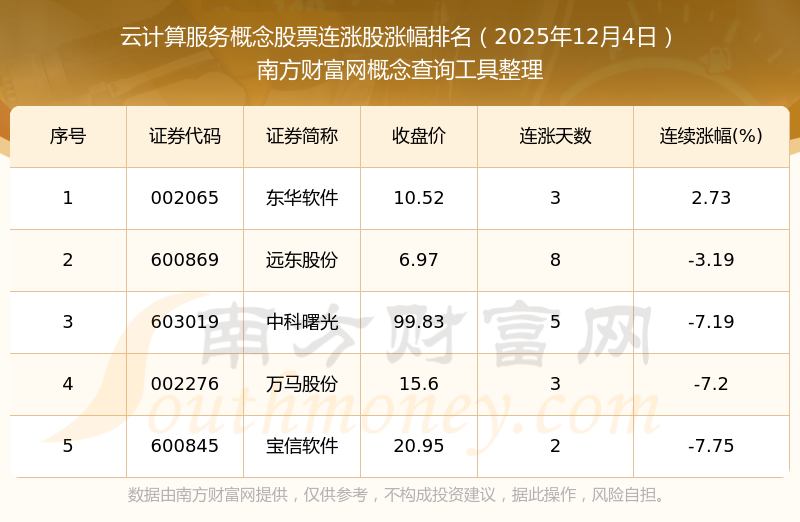2025年12月4日云计算服务概念股票连涨股涨幅排名