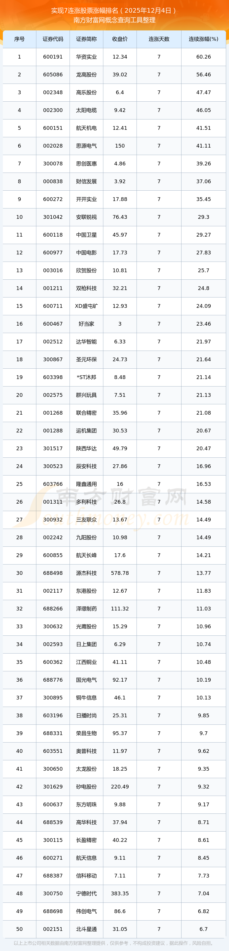 根据南方财富网概念查询工具数据统计,截止2025年12月4日收盘,共有94只个股实现7天连涨。其中连续涨幅较大的个股有华资实业、龙高股份、高乐股份等,连续涨幅分别为60.26%、56.46%、47.47%。