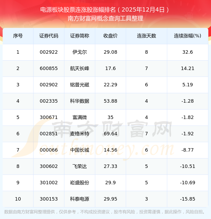 根据南方财富网概念查询工具数据统计,截止2025年12月4日收盘,电源板块股票共有10只个股实现连涨。其中连续涨幅较大的个股有伊戈尔、航天长峰、铭普光磁等,连续涨幅分别为32.60%、14.21%、5.19%。