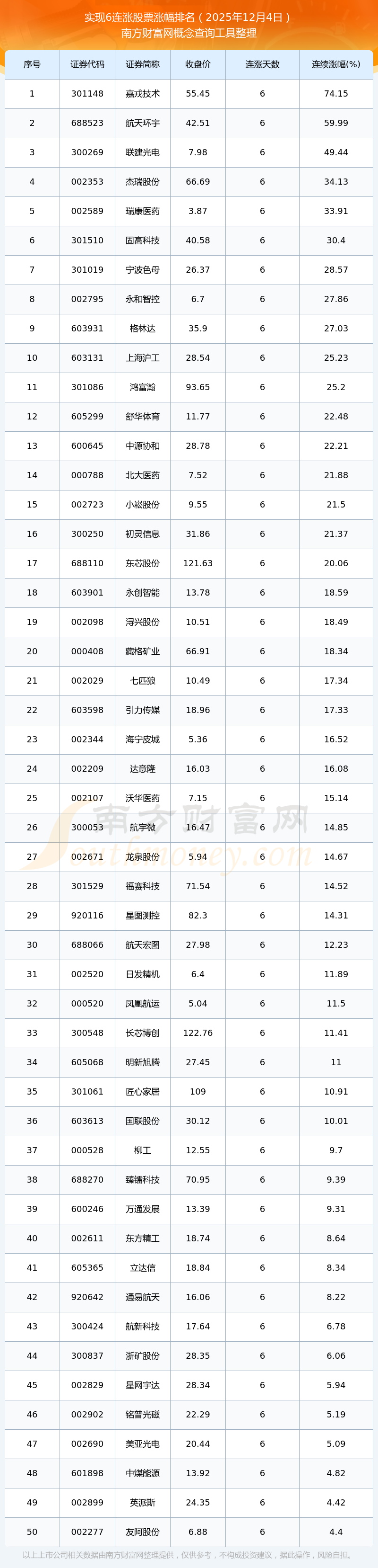根据南方财富网概念查询工具数据统计,截止2025年12月4日收盘,共有108只个股实现6天连涨。其中连续涨幅较大的个股有嘉戎技术、航天环宇、联建光电等,连续涨幅分别为74.15%、59.99%、49.44%。