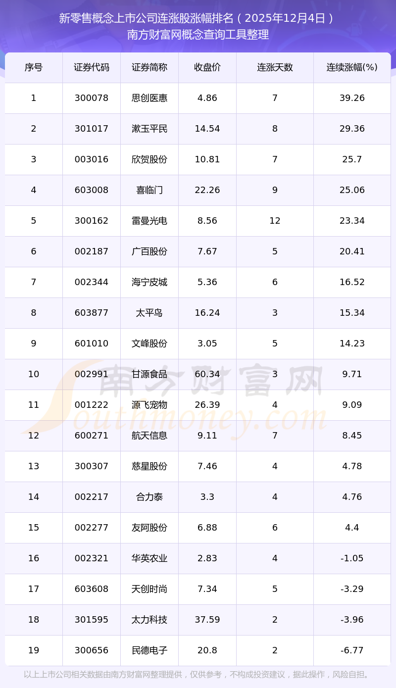 2025年12月4日新零售概念上市公司连涨股涨幅排名