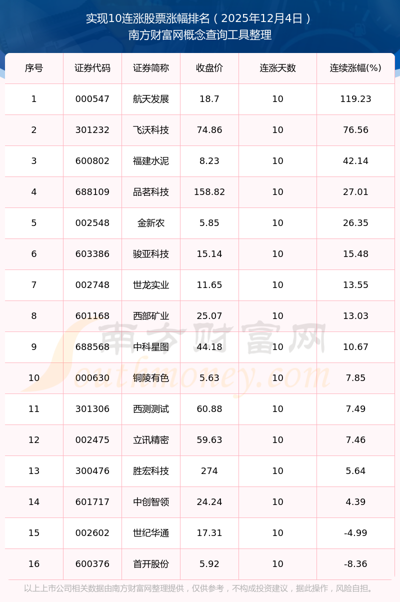 根据南方财富网概念查询工具数据统计,截止2025年12月4日收盘,共有16只个股实现10天连涨。其中连续涨幅较大的个股有航天发展、飞沃科技、福建水泥等,连续涨幅分别为119.23%、76.56%、42.14%。