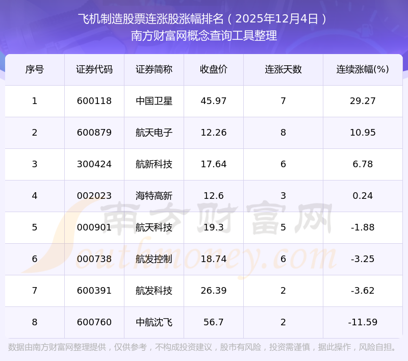 2025年12月4日飞机制造股票连涨股涨幅排名