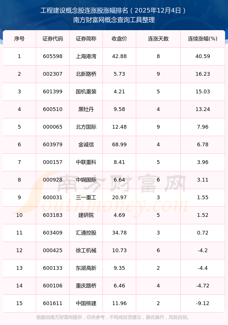 根据南方财富网概念查询工具数据统计,截止2025年12月4日收盘,工程建设概念股共有15只个股实现连涨。其中连续涨幅较大的个股有上海港湾、北新路桥、国机重装等,连续涨幅分别为40.59%、16.23%、15.03%。