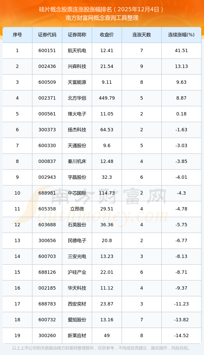 根据南方财富网概念查询工具数据统计,截止2025年12月4日收盘,硅片概念股票共有19只个股实现连涨。其中连续涨幅较大的个股有航天机电、兴森科技、天富能源等,连续涨幅分别为41.51%、13.13%、9.63%。