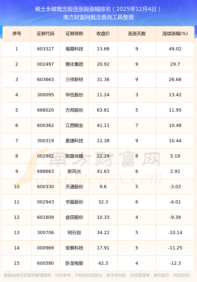 根据南方财富网概念查询工具数据统计,截止2025年12月4日收盘,稀土永磁概念股共有15只个股实现连涨。其中连续涨幅较大的个股有福蓉科技、雅化集团、三祥新材等,连续涨幅分别为49.02%、29.70%、26.66%。