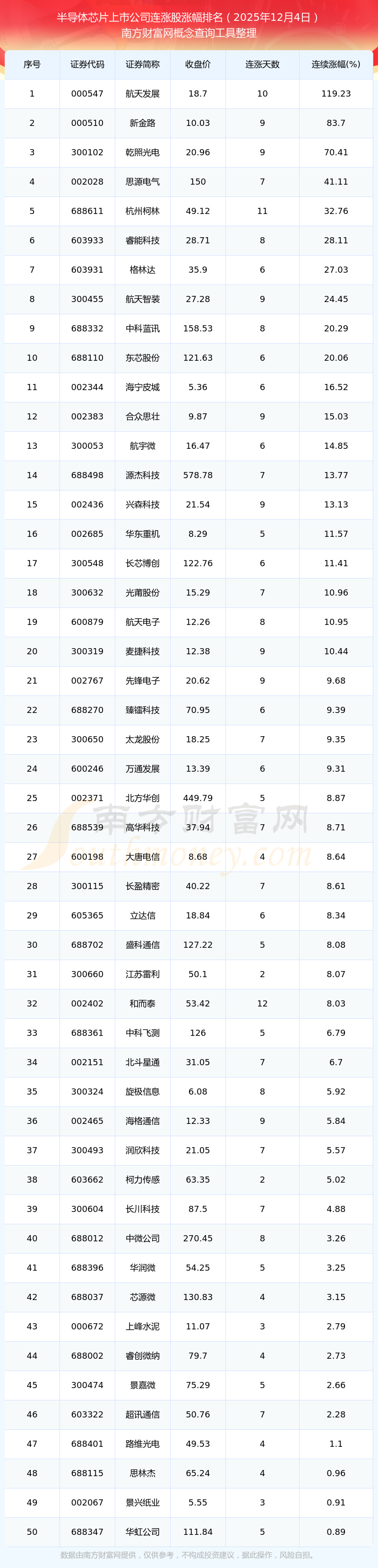 根据南方财富网概念查询工具数据统计,截止2025年12月4日收盘,半导体芯片上市公司共有118只个股实现连涨。其中连续涨幅较大的个股有航天发展、新金路、乾照光电等,连续涨幅分别为119.23%、83.70%、70.41%。