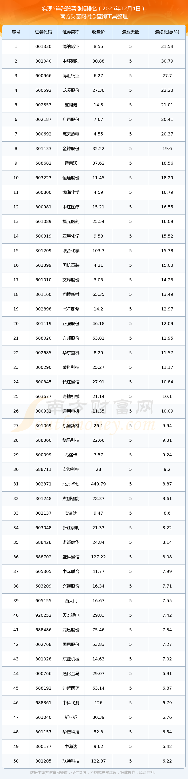 根据南方财富网概念查询工具数据统计,截止2025年12月4日收盘,共有144只个股实现5天连涨。其中连续涨幅较大的个股有博纳影业、中环海陆、博汇纸业等,连续涨幅分别为31.54%、30.79%、27.70%。
