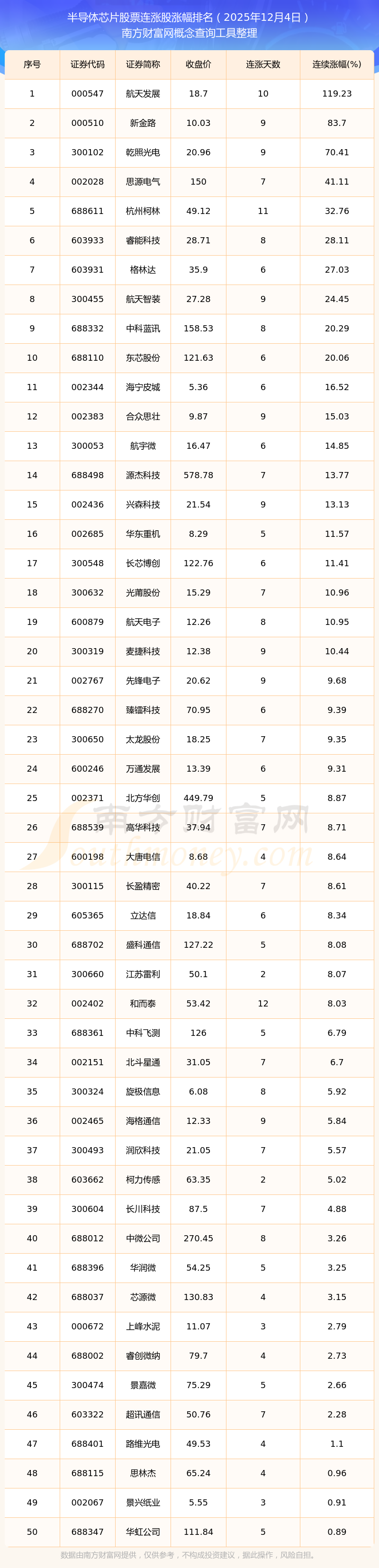根据南方财富网概念查询工具数据统计,截止2025年12月4日收盘,半导体芯片股票共有118只个股实现连涨。其中连续涨幅较大的个股有航天发展、新金路、乾照光电等,连续涨幅分别为119.23%、83.70%、70.41%。