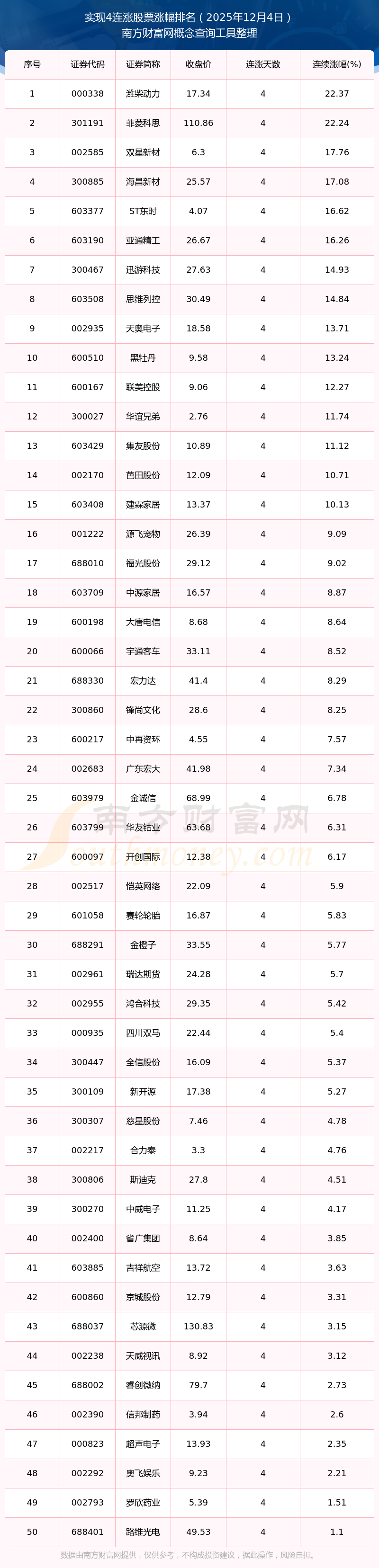 根据南方财富网概念查询工具数据统计,截止2025年12月4日收盘,共有128只个股实现4天连涨。其中连续涨幅较大的个股有潍柴动力、菲菱科思、双星新材等,连续涨幅分别为22.37%、22.24%、17.76%。